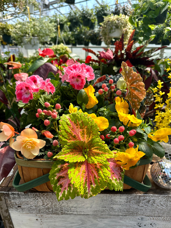 For the proud plant moms! Send a curated selection of flowering plants in a decorative basket. The planter in the photo shows a "premium" order.
